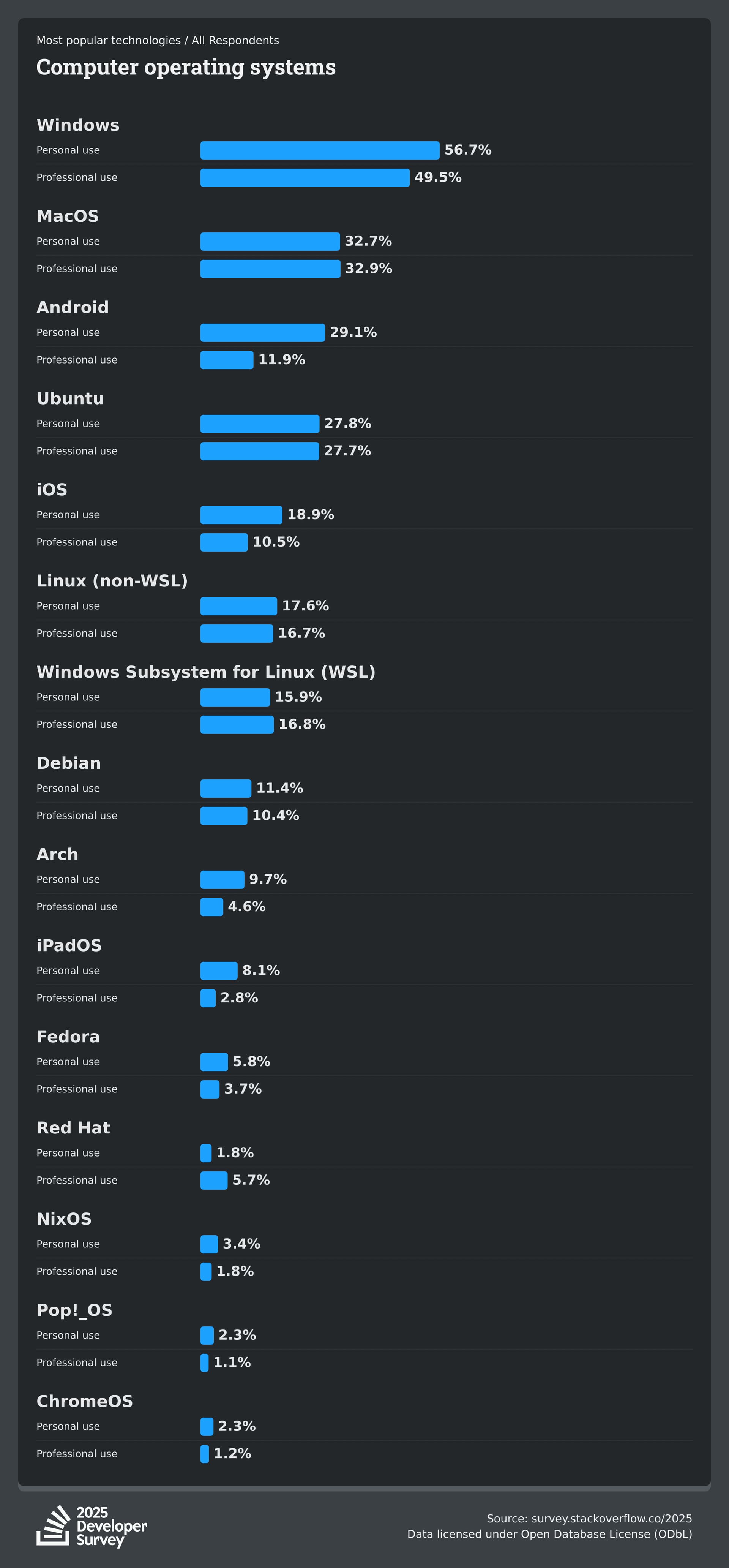 The [2025 Stack Overflow Developer Survey] indicates that Windows has a significantly higher market share withing software development. Being one of the primary profiles of Opal upon configuration, it seems that Windows would have a very high uptake.
